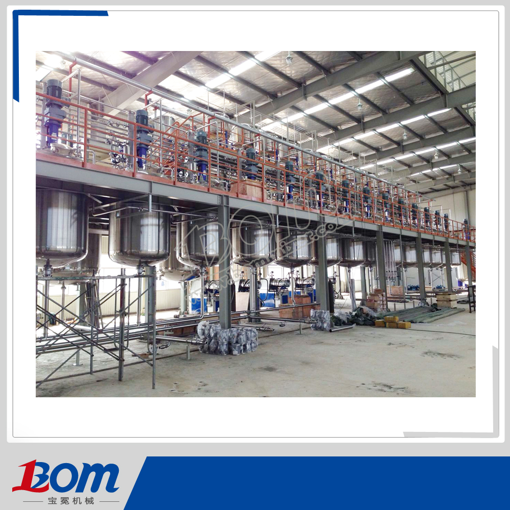 宝冕企业设计的成套设备,把常规工艺流程高度集成化,整体设备可以通过PLC自动程序控制,已可单独流程控制,中间环节通过真空上料或泵输送,全密闭管道连接;